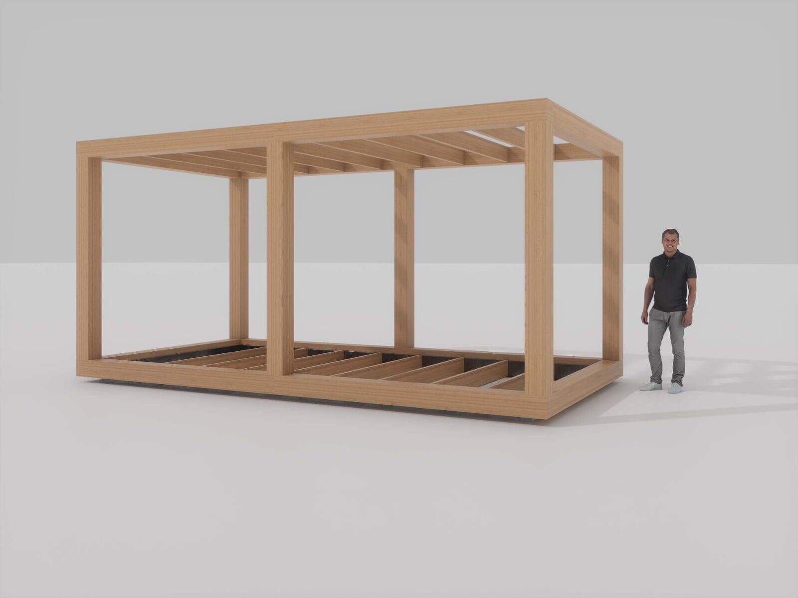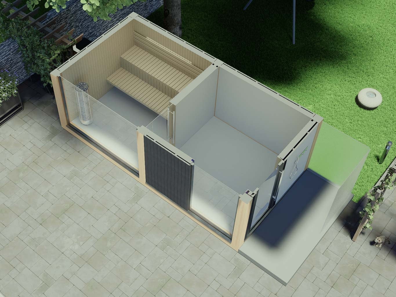 The sauna shown is our large sauna with standard seating and standard finishing. Concrete tiles are optional.