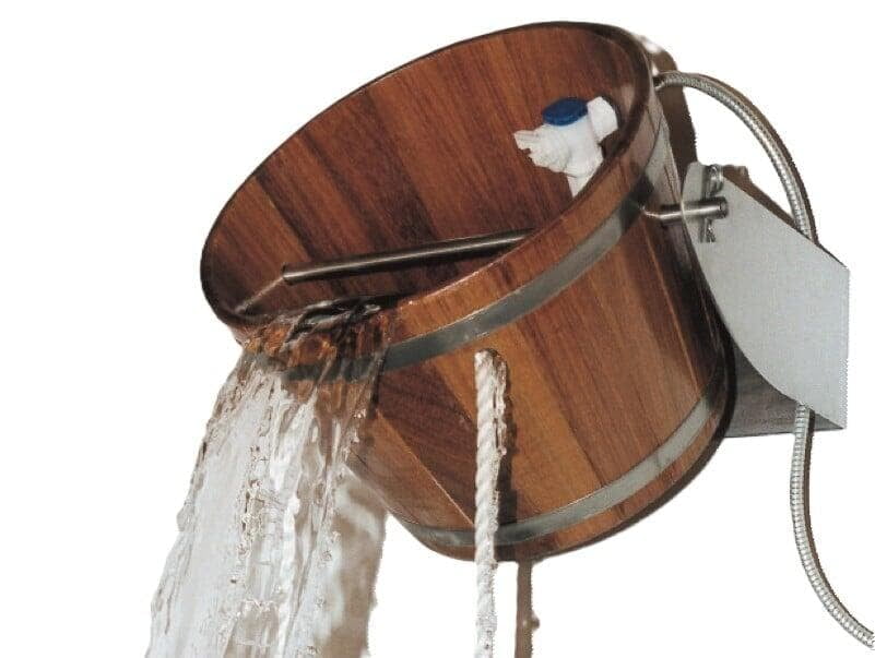 Made from fabulous Kambala Wood, TyloHelo's infamous 29 liter bucket shower can be used both indoors or outdoors. It features a very comfortable wide water downpour with easy to dispense water flow and is hand operated using a heavy white rope fastened to the bucket as a centered loop..